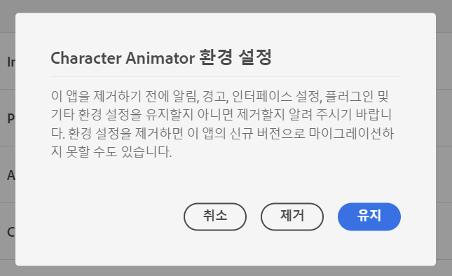 아래 설치된 앱에서 Adobe Character Animator 2023 버전을 제거하려고 합니다.