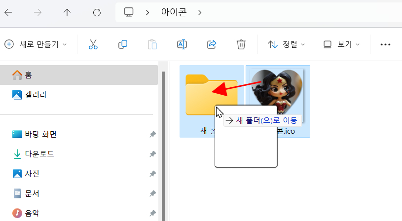 윈도우 기본 폴더를 개인 폴더로 바꾸기 위해서는 두 가지 방법이 있습니다. 첫 번째는 윈도우 샘플 아이콘을 쓰는 방법이 있고 두 번째는 내가 만든 ico 파일을 등록하는 방법이 있습니다. 내가 만든 아이콘은 바꾸려는 폴더 안에 집어넣습니다.