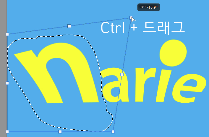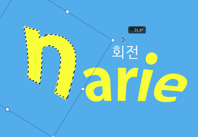 3. 선택된 부분을 Ctrl + T를 눌러 사이즈를 늘리고, 회전하고, 모서리 부분 Ctrl + 드래그하여 왜곡시킵니다. 같은 방법으로 i자의 윗부분도 변형합니다.