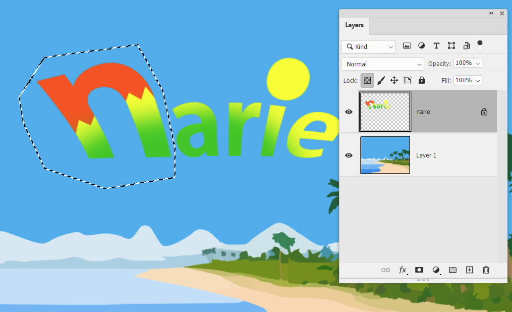 1. 문자 레이어를 선택하고, 문자의 일부분을 다각형 올가미 도구( Polygonal Lasso Tool)로 선택합니다.