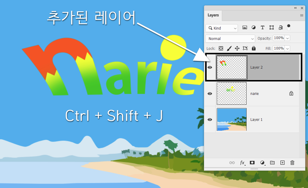 2. Ctrl + Shift + J 단축키를 누릅니다. 'n'자를 잘라내기 하여 새로운 레이어의 똑같은 위치에 붙여 넣기 합니다. 결과 이미지를 보면 이미지 위치는 그대로 유지하면서 새로운 레이어가 추가된 것을 확인할 수 있습니다.