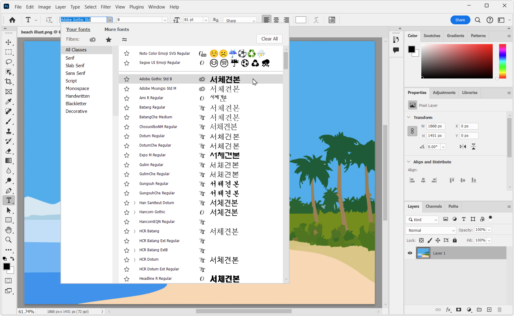 1. beach illust.png 소스 파일을 파일 (File) > 열기 (Open)으로 불러옵니다. > 단축키 Ctrl + 0을 눌러 화면을 채웁니다. > 왼쪽 도구상자에서 수평 문자 도구 (Horizontal Type too)을 선택합니다.