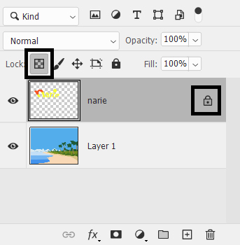3. 레이어 패널에서 잠그기 (Lock)에서 투명한 픽셀 잠그기 버튼을 선택하면 선택한 레이어 오른쪽에 자물쇠가 생깁니다. 브러시로 색을 칠할 때 문자 이외의 투명한 부분은 잠김 상태가 돼서 문자 부분만 색칠할 수 있습니다.