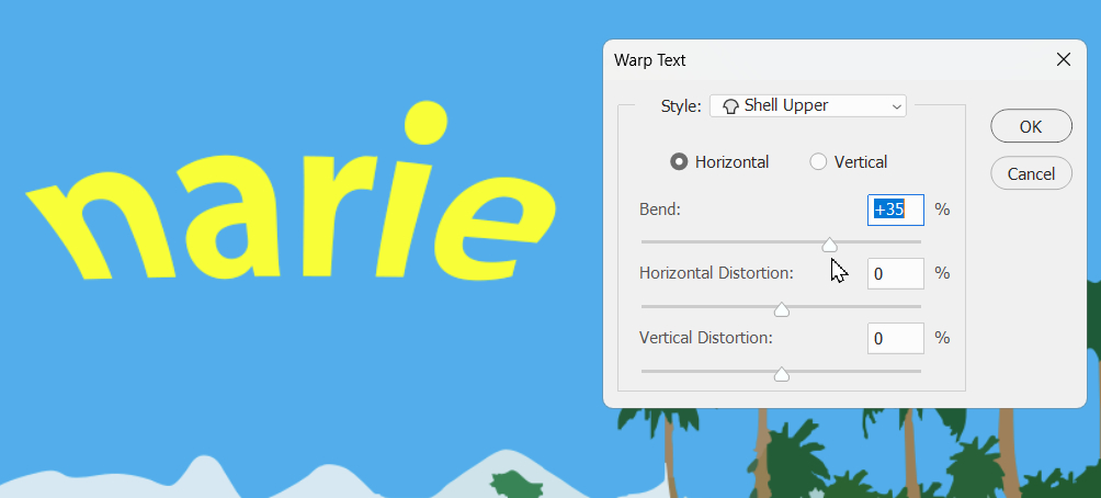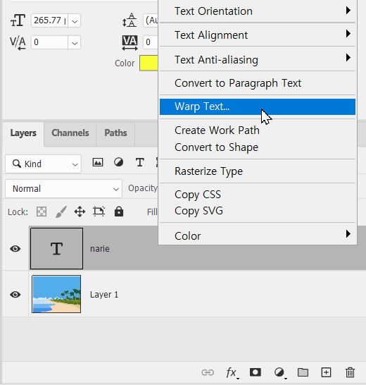 9. 텍스트 레이어 우측 빈 공간을 마우스 우클릭하여 텍스트 뒤틀기 (Warp Text) 메뉴를 선택하여 원하는 스타일을 선택하고 옵션 값을 조정합니다.