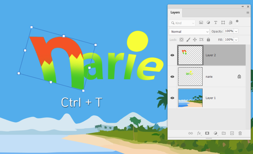 3. Ctrl + T 단축키를 눌러 모양을 변형시키고 문자를 겹치게 배치하고 Enter 키를 누릅니다. 화면상에 문자가 겹쳐 있더라도 레이어가 별도로 존재하기에 언제든지 위치를 조정할 수 있습니다.