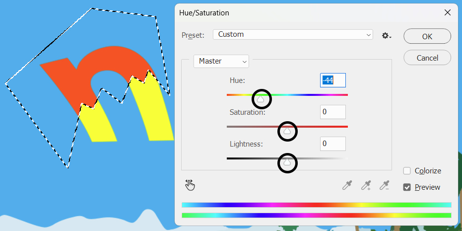 2. 이미지 > 조정 > 색조/채도... (Image > adjustments > Hue/Saturation... ) 메뉴나 단축키 Ctrl + U를 눌러 색조 (Hue) 슬라이더 바를 움직여 원하는 색으로 바꾸고, Ctrl + D 단축키로 선택 영역 해제합니다.