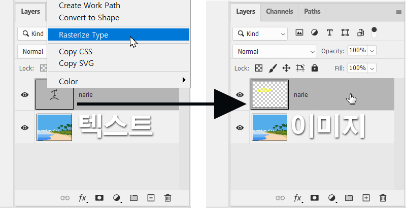 1. 텍스트 레이어 우측 빈 공간을 마우스 우클릭하여 문자 래스터화 (Rasterise Type) 메뉴를 선택합니다. T 자 형태의 썸네일 아이콘이 이미지 아이콘으로 모양이 바뀝니다.