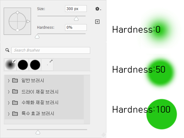 2. 마우스 오른쪽 버튼을 눌러 브러시 크기(Size) 300px 정도, 경도(Hardness) 0% 를 입력하고, Enter 키를 누릅니다. 경도 (Hardness)는 100에 가까울수록 브러시 경계선이 또렷해집니다. 0에 가까울수록 경계선이 부드럽게 페더(Feather) 값이 커집니다.