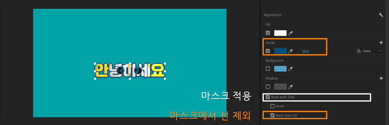 기본 그래픽 아래쪽에 텍스트 마스크 (Mask with Text)를 체크합니다. > 선 (Stroke)에 마스크를 포함시키고 싶지 않다면 채우기에만 마스크 적용 (Mask Only Fill)을 체크하면 마스크 범위에서 제외됩니다.
