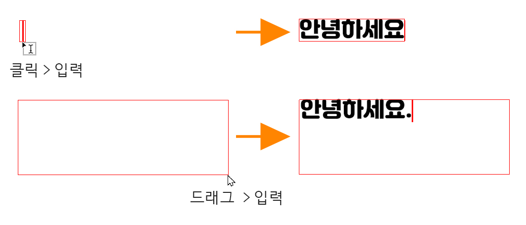 문자를 입력하는 방식은 포토샵이나 일러스트레이터와 마찬가지로 클릭 > 입력, 드래그 > 입력 방식이 있습니다.
