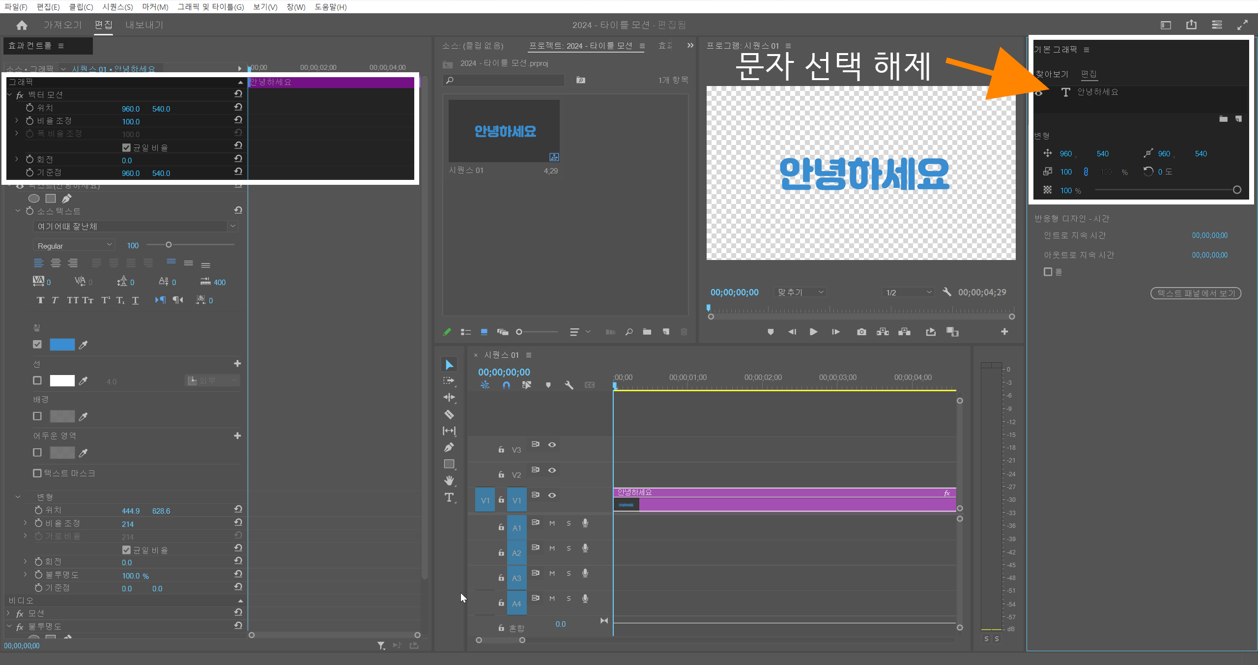 마스크를 적용하기 위해서 프레임 안에 문자가 앞에, 이미지나 영상을 뒤에 배치합니다. > 그리고 기본 그래픽의 레이어에서 '안녕하세요' 문자 레이어를 선택합니다.